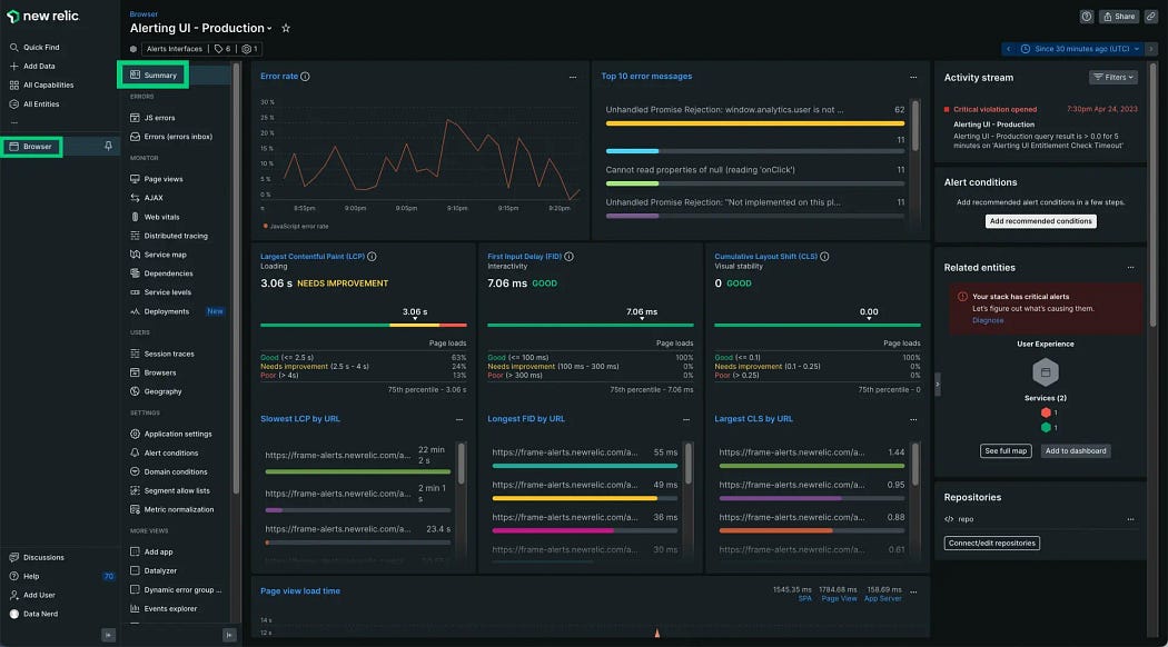 - Open your New Relic dashboard to view performance metrics such as page load times, JavaScript errors, and user interactions.